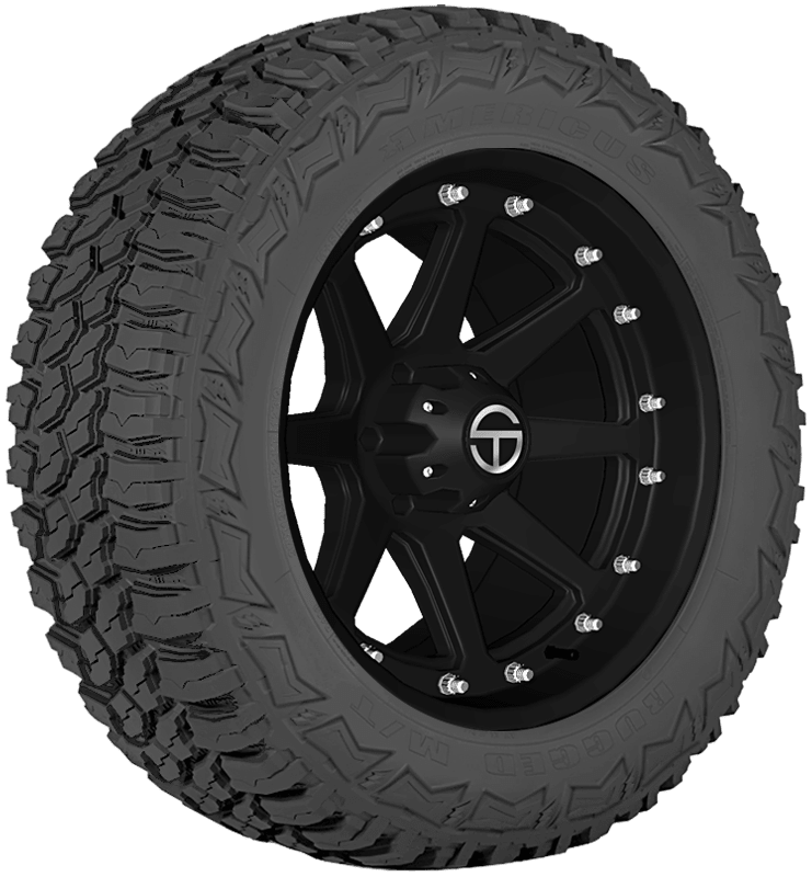 Features include: Designed for use on light trucks, SUVs, and jeeps; Tread is designed for use in mud and other off-road terrains such as dirt, sand, and rocks; High-void mud pattern with large shoulder blocks for deep traction and crisp handling in on- and off-road conditions; Self-cleaning tread design has “thunder-bolt” stone ejectors that protect the casing from damage; The self-cleaning tread has “thunder-bolt” stone ejectors for consistent traction and to protect the casing from damage; Joint-less spiral nylon over-wraps enhance toughness to protect against sidewall impacts; Jointless spiral nylon over-wraps provide extra toughness; Features a 3-ply construction in larger sizes; 3-ply body plies in larger sizes protect against sidewall impact – LT305x55R20 121/118Q Americus Rugged MT Light Truck Mud Terrain Tires, part number AMD2494 | Americus Rugged MT Mud Terrain Tires in Blackwall, LT305/55R20 121/118Q | SimpleTire