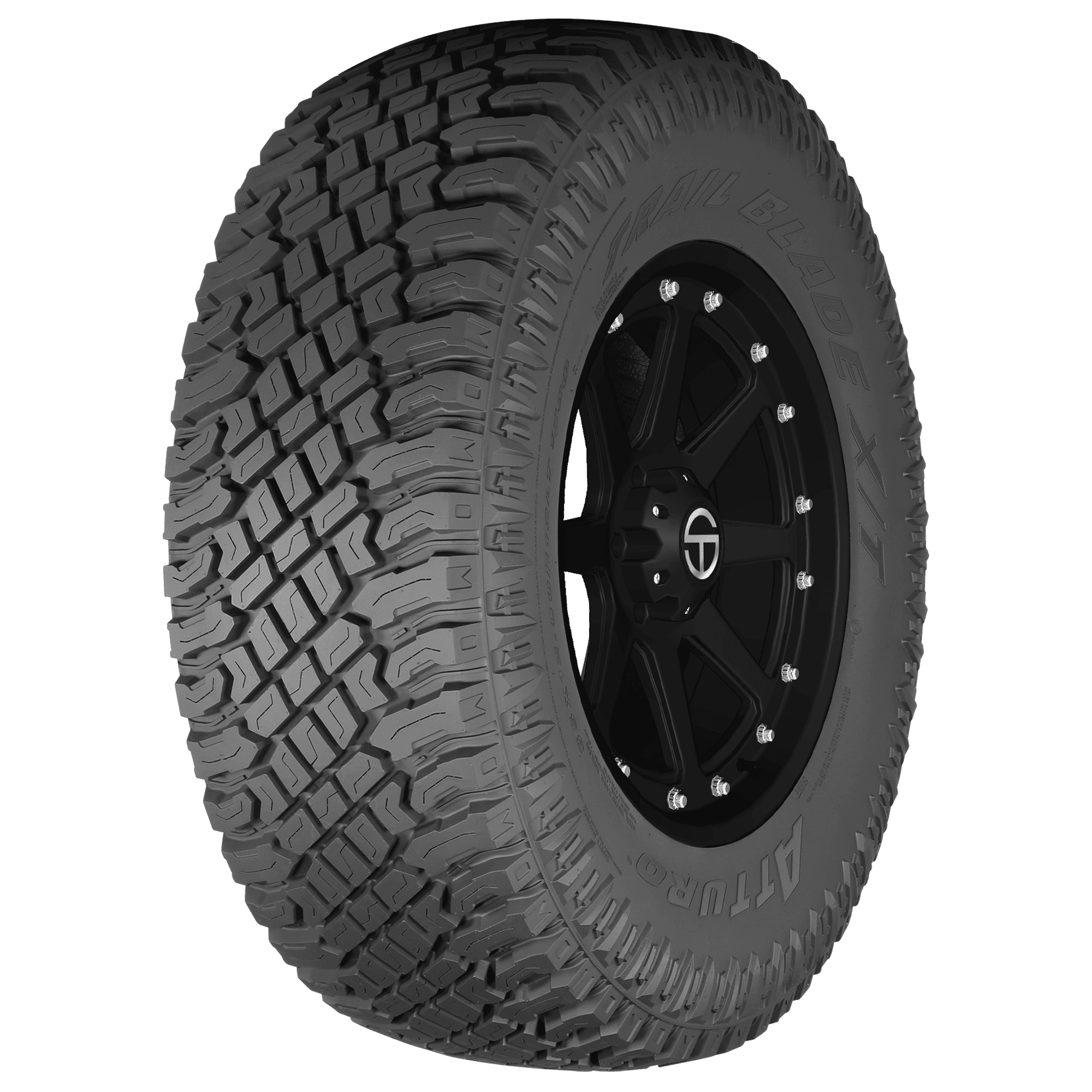 The multi-terrain Atturo Trail Blade X/T tire combines on the road comfort with commanding off-road performance. It blends the open shoulder design and sidewall tread lugs that boost traction in mud terrain with an optimized center block arrangement that delivers smoother rides. In wet conditions, the voids enable removal of water from the footprint to increase ride safety while sipes improve grip. Robust carcass and sidewall construction gives this tire added strength and endurance in off-road terrain. – Features include: Stylish “Knife Blade” design on sidewall provides aggressive looks; Rim guard protects wheels and sidewalls from curb damage; Smaller center blocks improve traction and handling performance on paved roads; Backed by a 45,000 mile limited manufacturer tread life warranty; Open shoulders and a blocky lug tread pattern force mud, dirt, rocks, sand, water, slush, and other debris out of the tread for consistent traction and to protect the casing from damage – 305x30R26 109H Atturo Trail Blade X/T Light Truck Rugged Terrain Tires, part number TBXT-KARR3PA | Atturo Trail Blade X/T Rugged Terrain in Blackwall, 305/30R26 109H | SimpleTire