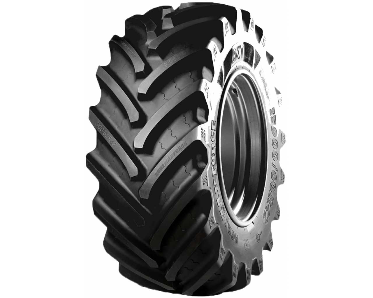 Agriculture & Forestry Tires / Radial IF Technology Tyres – Agrimax Force – Features include: Designed for use in agricultural and forestry applications; Commonly used on high-horsepower tractors and harvesters; Intelligent Flexion design for enhanced traction at lower inflation; Reinforced bead and casing increases strength and durability for a higher load carrying capacity and longer tread life; Tough rubber compound protects the tire against cuts, chips, and abrasions – 900/50R42 180D BKT Agrimax Force OTR Tires, part number 94058471 | BKT Agrimax Force OTR Tires in Tubeless, 900/50R42 180D | SimpleTire