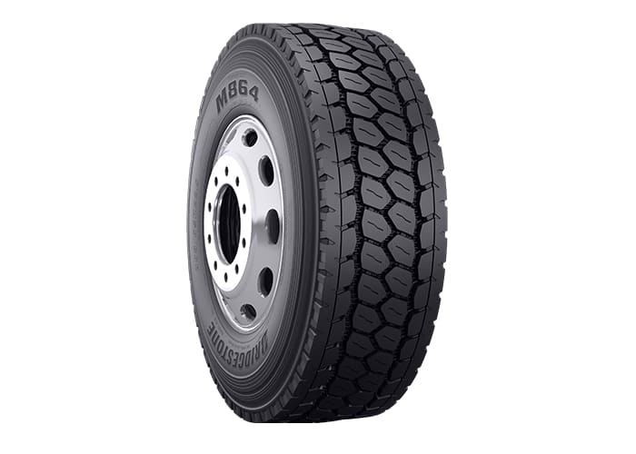Features include: Improved tread pattern and extra-deep tread grooves improve wet and dry traction; Stone rejectors help protect tread base and belts against punctures and damage from stones or debris; Three steel belts with one extra-wide steel belt provide stability; Protective ribs enhance resistance to cuts, snags, abrasions, curb damage; Rim/Wheel is not included with purchase – 445/65R22.5 169K Bridgestone M864 Commercial Tires, part number 001074 | Bridgestone M864 Trailer Tires in Blackwall for Commercial Vehicle, 445/65R22.5 169K | SimpleTire