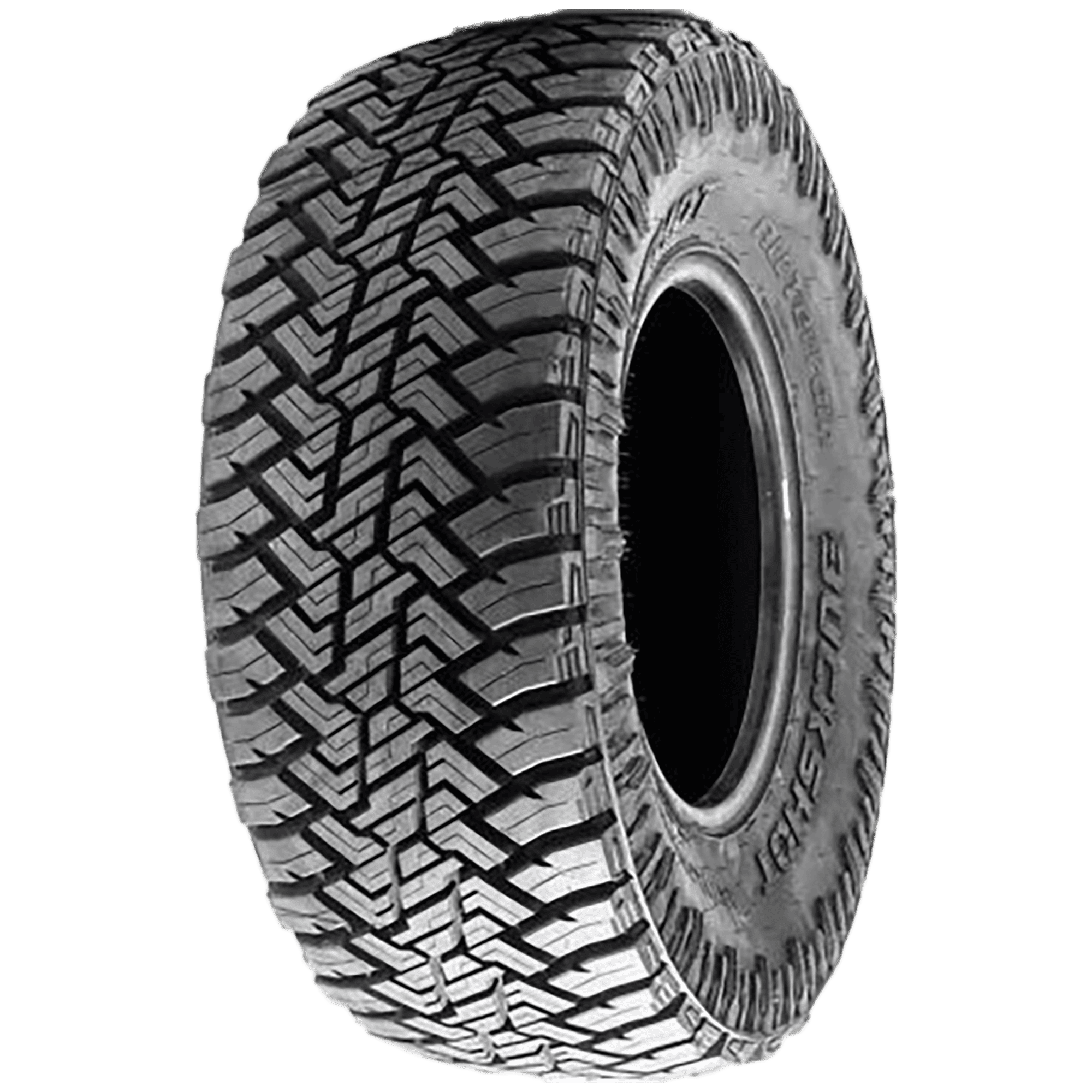 Features include: An aggressive tread pattern with excellent self-cleaning abilities delivers strong traction in mud, dirt, loose sand, and on trails; Aggressive tread pattern with good self-cleaning abilities provides solid traction in mud, dirt, loose sand, and trails; Robust and durable construction boosts off-road capability on rocky terrain and enhances load-carrying capacity; Strong and durable construction enhances off-roading abilities on rocks and enhances load-carrying capacity; An optimized tread pattern improves steering response and stability when driving on paved roads; Optimized tread pattern improves steering response and stability on paved roads; Solid shoulder blocks with sharper biting edges ensure better cornering and superior traction performance; Solid shoulder blocks with sharper biting edges ensure better cornering and traction performance; Wider zigzag grooves efficiently clear water and slush from the contact patch, providing increased year-round grip and optimal hydroplaning resistance; Wider zigzag – LT275x65R20 126/123R Buckshot All Terrain Light Truck All Terrain Tires, part number CBSAT15 | Buckshot All Terrain Tires in Blackwall, LT275/65R20 126/123R | SimpleTire