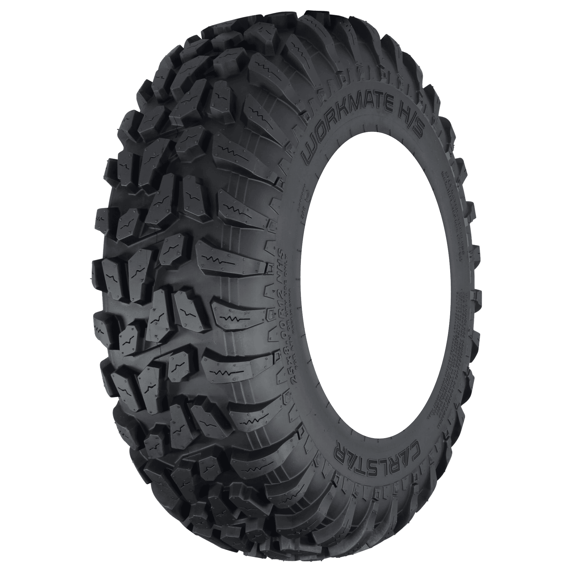 Features include: Features an aggressive, extra-deep tread that maximizes wear life and provides superior traction throughout the tire’s service life, minimizing replacement frequency; Specialized tread pattern provides excellent drive traction and self-cleaning, ensuring reliable grip for skid steers and other equipment on soft or loose surfaces; Built with a reinforced bias-ply casing that is engineered for maximum structural stability and exceptional puncture resistance, withstanding severe impacts in industrial environments; Robust construction and deep tread provide high resistance to cuts, chips, and abrasions, ensuring reliable performance and long machine uptime in demanding conditions – 25×10.00R-12 49N Carlstar Work Mate HS ATV/UTV Tires, part number 6P20141 | Carlstar Work Mate HS ATV/UTV Tires, 25/10.00R-12 49N | SimpleTire