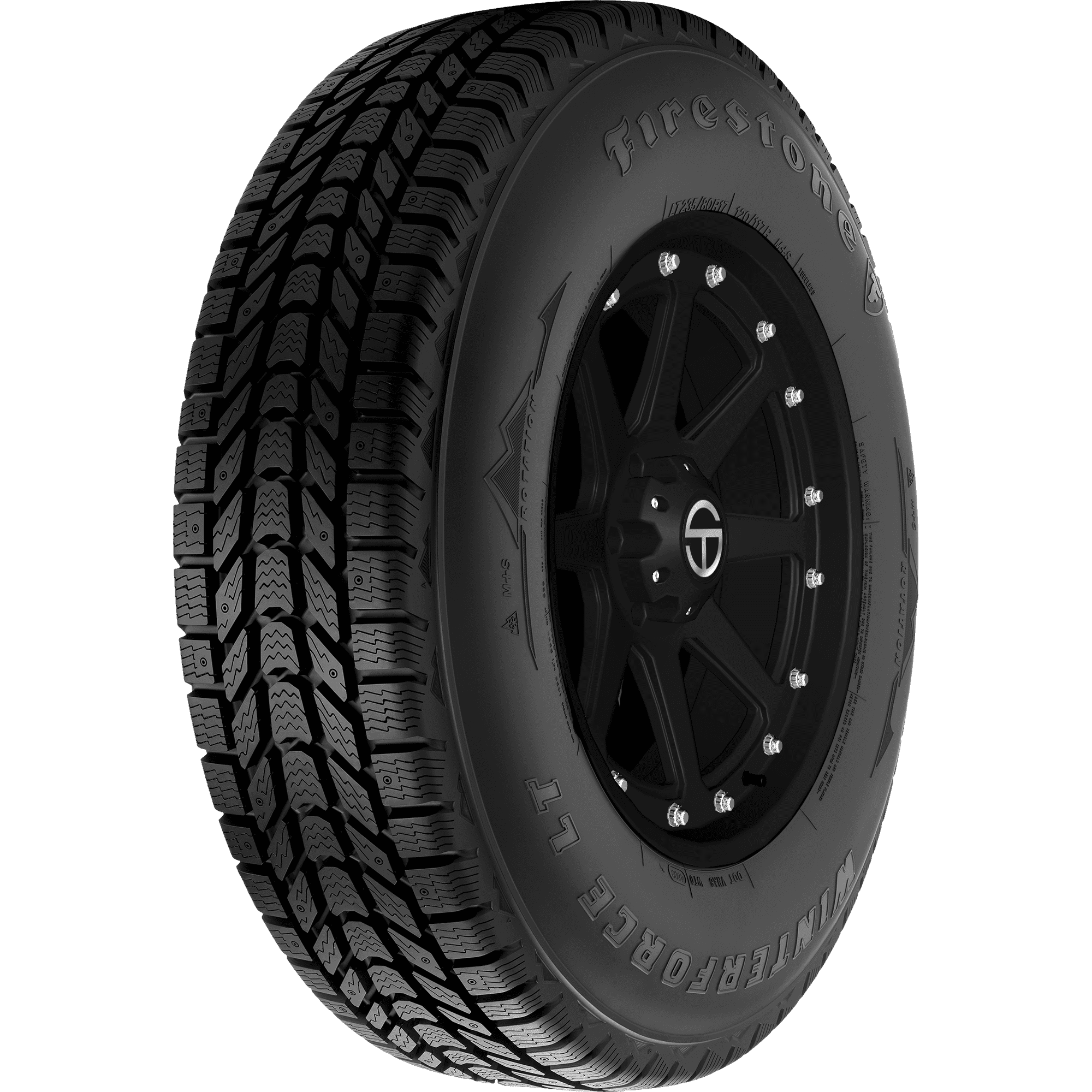 Designed for use on light trucks, SUVs, and commercial vans, the WinterForce LT is a studdable winter tire that provides drivers with solid traction in icy, snowy, and wet conditions. – Features include: Designed for use on commercial light trucks in winter weather conditions; should not be used when temperatures are consistently above 45 degrees Fahrenheit; Winter tread; should not be used when temperatures are consistently above 45 degrees Fahrenheit; Black sidewall; Specialized winter tread compound keeps the tire flexible for use in sub-freezing temperatures; Three Peak Mountain Snowflake certified for use in severe winter weather conditions; Backed by Firestones 90 day Buy and Try Guarantee on tires sold in sets of 4 or more (certain restrictions and limitations apply); Extra-deep tread grooves funnel water and slush out of the tread to increase hydroplaning resistance; Directional tread design ensures quieter and more comfortable rides; Pre-drilled for easy installation of studs, where permitted, for extra traction in extreme winter weather – LT285x75R16 126/123R Firestone Winterforce LT Light Truck Winter Tires, part number 246386 | Firestone Winterforce LT Winter Tires in Blackwall, LT285/75R16 126/123R | SimpleTire