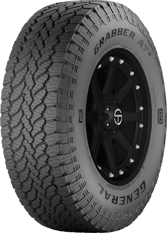 Features include: All-terrain tread; Designed for use on light trucks and SUVs; Black or Outlined White Letter (OWL) sidewall depending on the tire’s size; Built with an aggressive, innovative tread pattern that creates additional gripping edges for better traction on loose surfaces; Large sidewall lugs and stacked deflection ribs protect the tire against stones, rocks, and other debris; Three Peak Mountain Snowflake certified for use in moderate to severe winter weather conditions; Open shoulders promote self-cleaning for consistent traction and to protect the casing from damage; Large tread blocks and optimized siping keep the tire stiff to fend off uneven wear from high-torque applications; Uniform block geometry and optimized tread blocks work together to lower road noises and vibrations for a quieter ride on paved roads; Duragen Technology increases strength and durability for a higher load carrying capacity and a longer tread life; Built with ultra high-strength steel belts that improve stability by putting more rubber o – LT285x60R18 121/118S General Grabber AT3 Light Truck All Terrain Tires, part number 01171055110 | General Grabber AT3 All Terrain Tires, LT285/60R18 121/118S | SimpleTire
