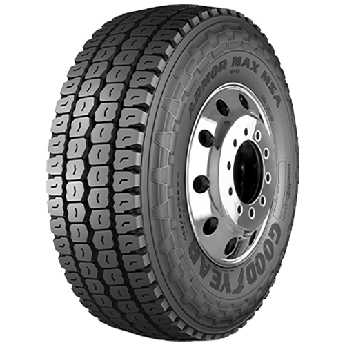 Features include: Designed for use on all positions of trucks in mixed service construction, emergency, logging and oil field, and mining applications; Advanced tread compounding optimizes resistance to chips/chunks and treadwear and minimizes rolling resistance; Built with a deep, open tread pattern that improves off-road handling performance while also forcing rocks, stones, and other debris out of the tread for consistent traction and to protect the casing from damage; Deep, open tread pattern with stone protectors enhances traction for off-road handling and provides resistance to stone retention and drilling; A special rubber compound guards the tire against cuts, chips, and uneven wear for a longer tread life; Enhanced casing with steel belt package helps offer toughness and outstanding performance through multiple retread cycles; Steel belts and a strong casing increase strength and durability while also boosting retreadability; Meets Three Peak Mountain Snowflake performance requirements for providing traction and accel – 445/65R22.5 168K Goodyear Armor Max MSA Non Duraseal Commercial Tires, part number 756515897 | Goodyear Armor Max MSA Non Duraseal Trailer Tires in Blackwall for Commercial Vehicle, 445/65R22.5 168K | SimpleTire