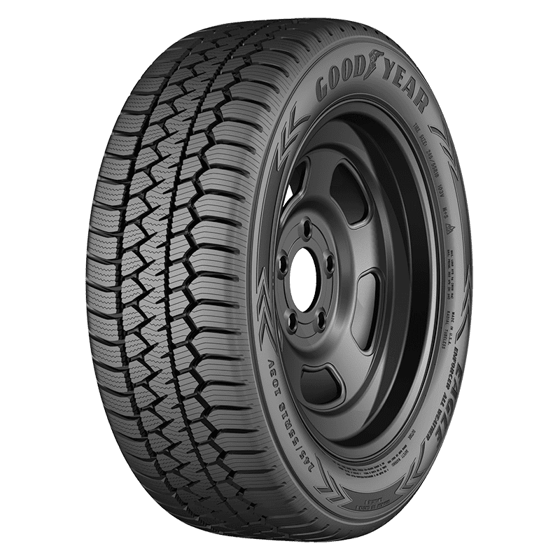 Features include: All-weather tread; Black sidewall; Built with aggressive shoulder blocks and wide lateral grooves that enhance maneuverability in dry, wet, and snowy conditions; Robust construction is designed to help drivers handle the demands and operating conditions that police vehicles encounter; Wide lateral grooves and aggressive shoulder blocks boost maneuverability in dry, wet, and snowy conditions; Asymmetric tread design with wide, sweeping tread grooves provides powerful traction and control in dry, wet, and snowy conditions while also enhancing steering response; Silica-infused soy-based rubber compound allows for year-round traction; Multi-zone tread formulation increased grip for better handling and cornering stability – 235/50R17 96V Goodyear Eagle Enforcer A/W Passenger All Weather Tires, part number 732008558 | Goodyear Eagle Enforcer A/W All Weather Tires in Blackwall, 235/50R17 96V | SimpleTire