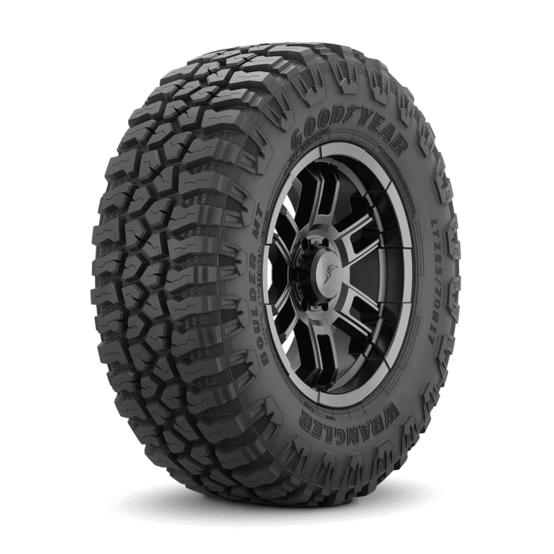 Features include: All-terrain tire; Black sidewall; Aggressive and deep-lug tread pattern provides superior traction; Mud and stone ejectors prevent stones from becoming trapped in the grooves; Reinforced sidewalls enhance durability in challenging off-road conditions – LT295x65R20 129/126Q Goodyear Wrangler Boulder MT Light Truck Mud Terrain Tires, part number 753017002 | Goodyear Wrangler Boulder MT Tires in Blackwall, LT295/65R20 129/126Q | SimpleTire