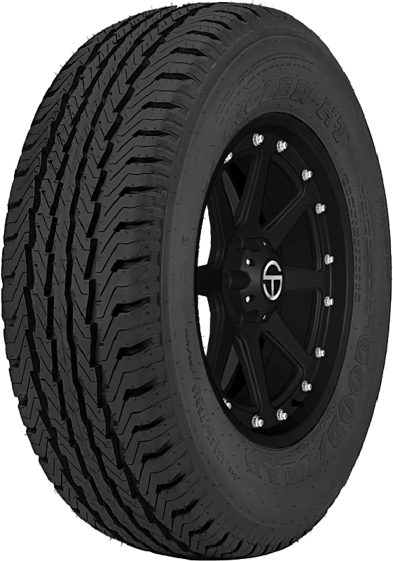 An all-season tire designed for use on heavy-duty trucks and full-sized vans, the Wrangler HT offers drivers year-round traction plus a long tread life. – Features include: All-season tread; Black sidewall; Solid center rib gives drivers a smooth ride plus long, even wear; Dependable wet weather traction; Circumferential grooves for quiet ride and sure grip; Made for heavy duty trucks and full-size vans – LT245x75R16 120/116R Goodyear Wrangler HT Light Truck All Season Tires, part number 744395900 | Goodyear Wrangler HT All Season Tires in Blackwall, LT245/75R16 120/116R | SimpleTire