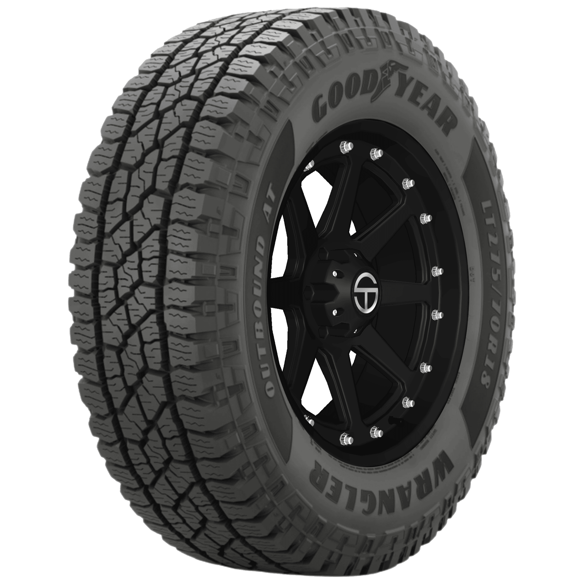 Features include: Backed by a 65,000 mile limited manufacturer tread life warranty; Cutting-edge tread design for quiet and comfortable ride quality; Use of DuPont Kevlar boosts durability and resists cuts, chips, and abrasions; Traction claws provide extra biting edges for improved on and off-road performance; Balanced void ratio ensures it quickly removes debris, dirt, and stones along with water for consistent grip and traction – LT265x70R18 124/121R Goodyear Wrangler Outbound AT Light Truck All Terrain Tires, part number 755015001 | Goodyear Wrangler Outbound AT Tires in Blackwall, LT265/70R18 124/121R | SimpleTire