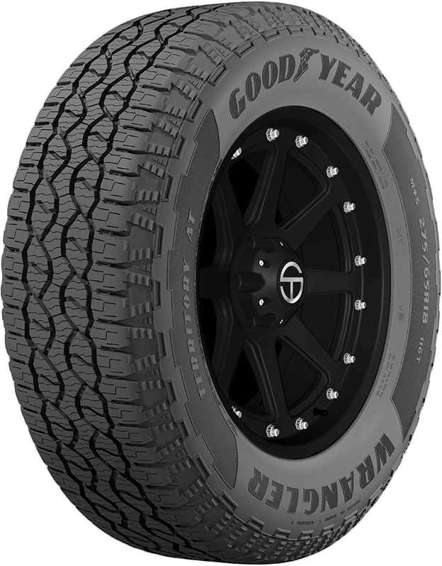 Features include: All-terrain tread; Aggressive tread pattern allows for strong traction on- and off-road; Black or Outlined White Letter (OWL) sidewall depending on the tire’s size; Tough rubber compound increases strength and durability for a higher load carrying capacity and longer tread life; Used as Original Equipment on the 2021 Ford F-150; Computer optimized design eliminates road noises and vibrations to improve ride comfort; Built with a tough rubber compound that improves strength and durability for a higher load carrying capacity and longer tread life; Angled center rib boosts handling capabilities – 265x65R18 114T Goodyear Wrangler Territory AT Light Truck All Terrain Tires, part number 734110586 | Goodyear Wrangler Territory AT All Terrain Tires in Outlined White Lettering, 265/65R18 114T | SimpleTire