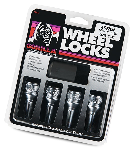 14mm x 1.50 thread size 17mm hex size 2.25″ overall length and 1.25″ thread length Cone seat Set of 4 bolt locks