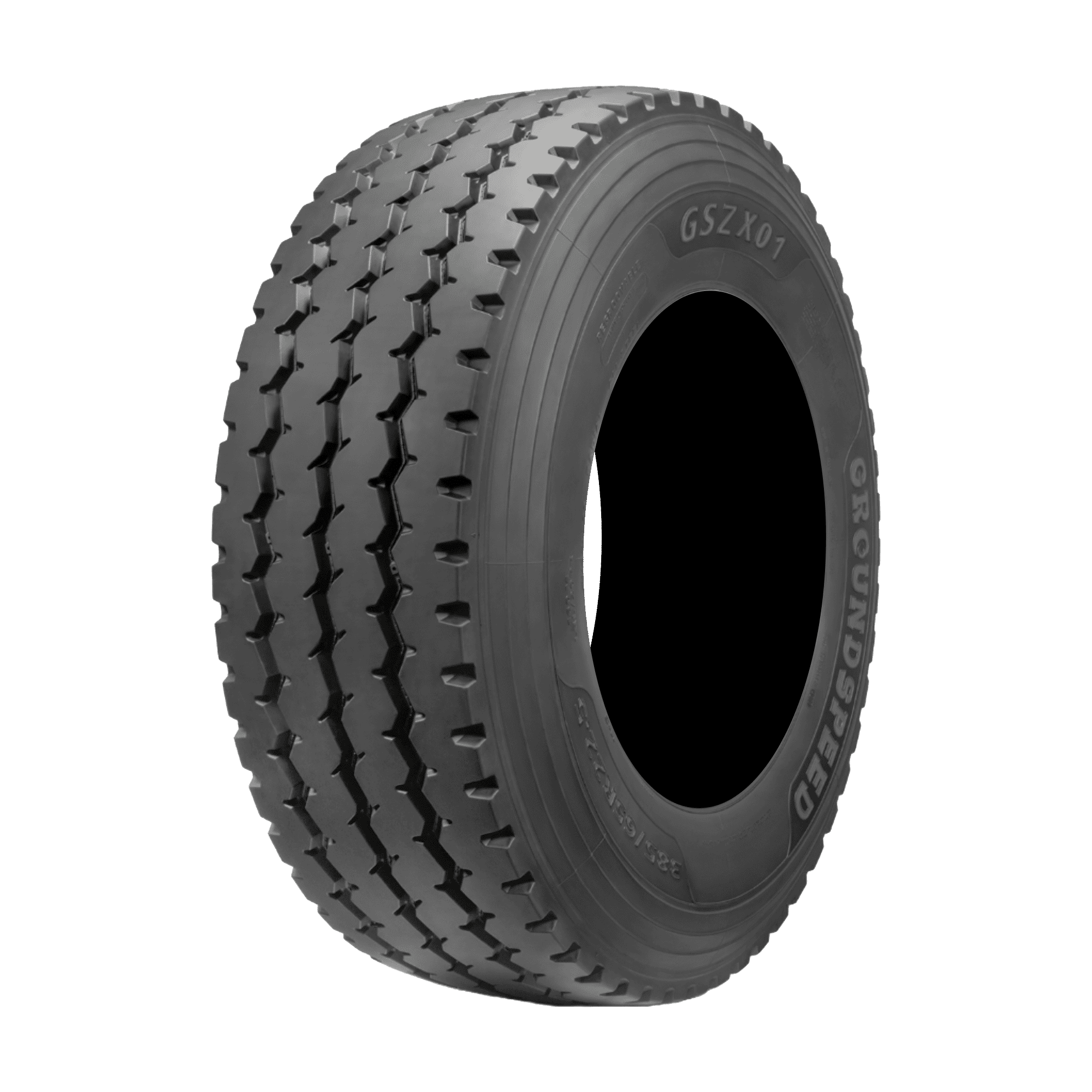 Features include: Mixed service all-position wide tire for semi trucks; Solid shoulder ribs reduce deflection, enhancing stability, promoting even tread wear, and increasing fuel efficiency; Stone ejectors protect the tire from punctures by forcing out stones and preventing them from lodging in the tread grooves; Three deep, circumferential grooves improve traction in wet and dry conditions, ensuring a confident grip on various surfaces; KTM4 Tread Compound balances performance with cut and chip resistance, making it perfect for on- and off-road use – 385/65R22.5 Groundspeed GSZX01 Commercial Tires, part number 841623150327 | Groundspeed GSZX01 Trailer Tires for Commercial Vehicle, 385/65R22.5 | SimpleTire