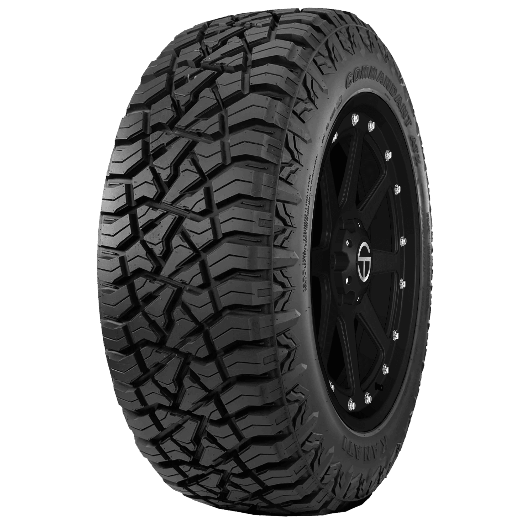 Features include: Heavy-duty all-terrain tire for light trucks and SUVs; Heavy-duty all-terrain tire for light trucks, Jeeps, and SUVs; Designed for use on SUVs, light trucks, and Jeeps; High ply rating for extra strength and durability; Features solid high-ply rated construction that increases strength and load-carrying capacity; Reinforced sidewall guards the tire against damage for a longer tread life; Sidewall resists punctures, impacts, and pinch-flat rolling while low air pressure off-roading; Aggressive all-terrain tread pattern for good traction and performance on- and off-road; Reinforced structure promotes high-speed stability while hauling heavy loads; Tread pitch is randomized for a quiet ride on the highway; M+S rated to offer dependable performance in mud and snow – LT295x60R20 129/126Q Kanati Commandant ATX Light Truck All Terrain Tires, part number LCO2029560F | Kanati Commandant ATX All Terrain Tires in Blackwall, LT295/60R20 129/126Q | SimpleTire