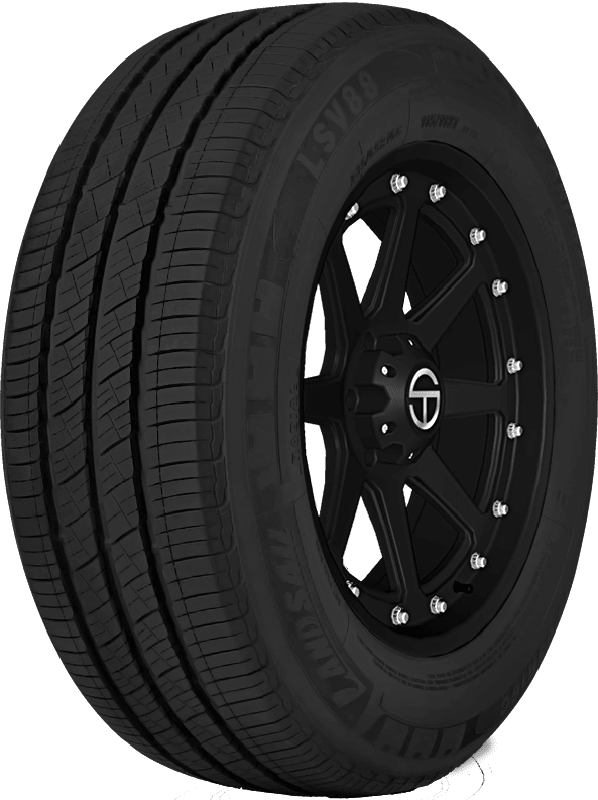 Features include: Low rolling resistance means better fuel economy; Tough carcass and casing for long hours of service; Tubeless design; Three circumferential grooves move water away from contact patch to resist hydroplaning – 205x65R15 102/100T Landsail LSV88 Light Truck UHP Summer Tires, part number 150638 | Landsail LSV88 UHP Summer Tires, 205/65R15 102/100T | SimpleTire