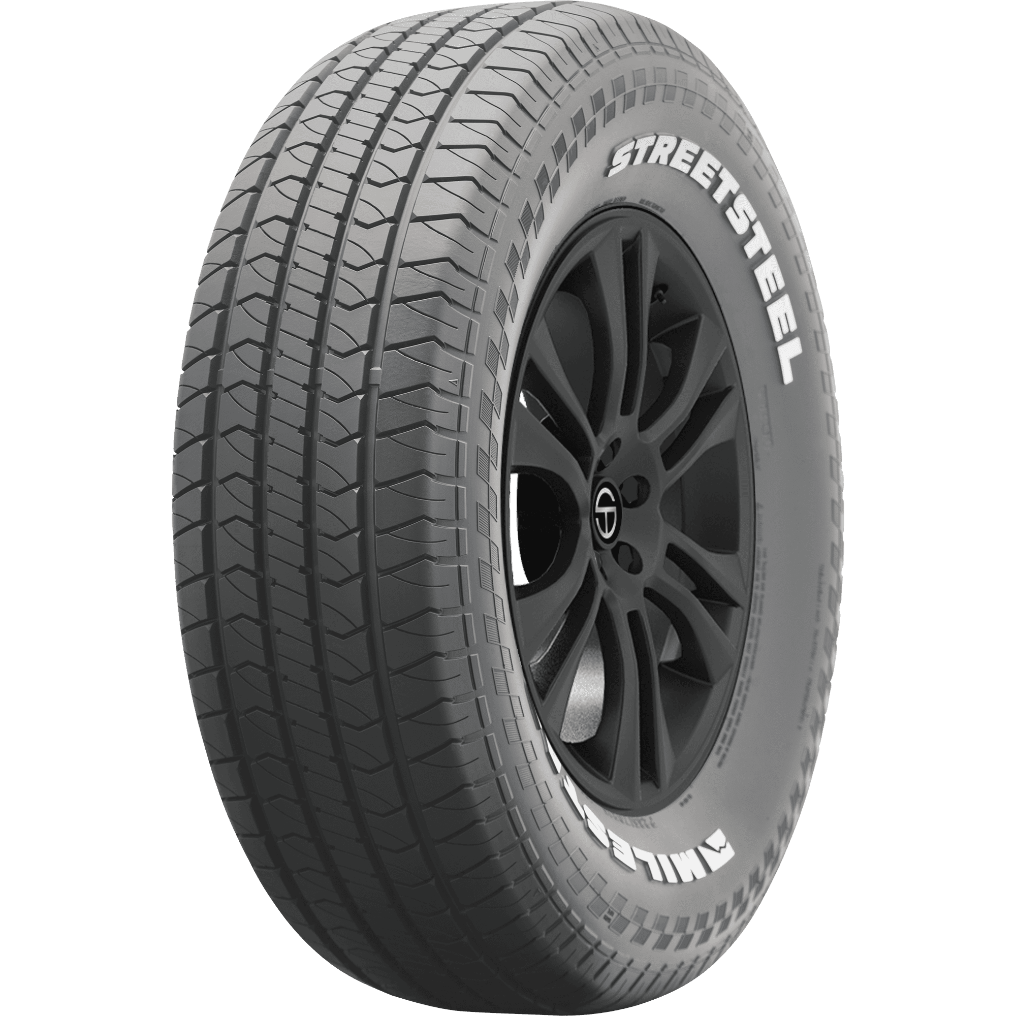 Features include: Classic sidewall design featuring a vintage checkered flag with solid white lettering; Tread is designed for strong year-round performance; Angled siping and notched center rib increases stability and provides excellent grip in all conditions; Classic raised white letter sidewall and a checkered flag design are sure to help your ride standout; Angled shoulder design improves cornering capabilities and steering stability; Backed by a 40,000 mile limited manufacturer tread life warranty; Circumferential grooves optimize water evacuation for enhanced wet traction; Angled siping pattern and four circumferential grooves provide a wide contact patch for superior grip and wet performance; Steel-belted construction for durability and performance; Shoulder block design improves cornering and stability; Designed for a variety of todays vehicles, including muscle car and classic truck application – P245/60R15 100T Milestar Streetsteel Passenger All Season Tires, part number 24377501 | Milestar Streetsteel All Season Tires in Raised White Lettering, P245/60R15 100T | SimpleTire