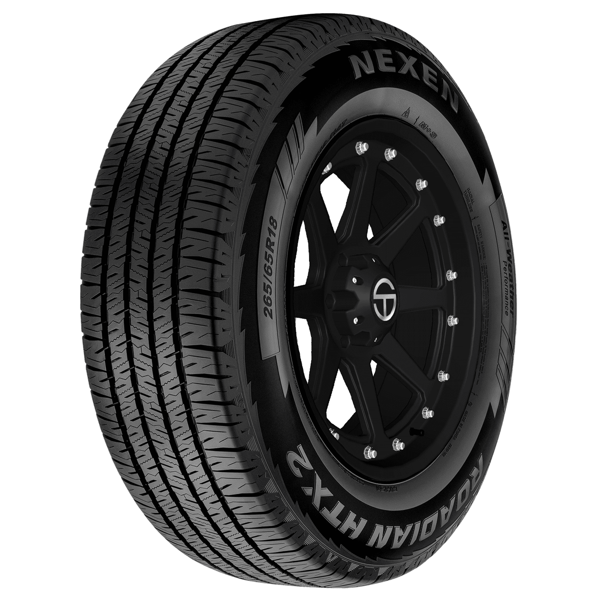 Features include: Covered by Nexen’s best-in-class Total Coverage Warranty which includes a 70,000 mile tread wear warranty for P-metric sizes and a 50,000 mile warranty for LT sizes, Road Hazard for the first 3/32″ or 2 years, 36-months of Roadside Assistance, and a 45-day/500-mile Free Trial; All-weather tread pattern; Three Peak Mountain Snowflake certified to withstand and perform in heavy snow, ice, and tough terrains (except OE tires); Raised white letter (RWL) or Black sidewall depending on the tire’s size; Better high-speed durability thanks to cooling pins within the shoulders that effectively dissipate heat when driving at higher speeds; 70,000 mile limited manufacturer tread life warranty for P-metric sizes, and a 50,000 mile limited manufacturer tread life warranty for LT sizes; Emerging 3D sipes and changing sipe technology work together to improve snow traction, boost handling, and fend off irregular wear; Three Peak Mountain Snowflake certified for use in moderate to severe winter weather conditions; Built with – 265x70R18 116T Nexen Roadian HTX2 Light Truck All Weather Tires, part number 17968NXK | Nexen Roadian HTX2 All Weather Tires in Blackwall, 265/70R18 116T | SimpleTire