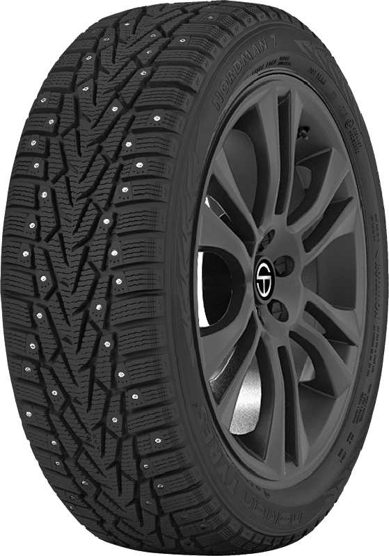 Features include: Designed for use on coupes, sedans, and minivans in winter weather conditions; should not be used when temperatures are consistently above 45 degrees Fahrenheit; Winter tread design; Three Peak Mountain Snowflake certified; Black sidewall; Pinned with studs for extra traction in severe winter weather; Pinned with studs to enhance traction on ice, slush, and snow covered roads; Aggressive, directional tread pattern enhances traction and handling performance; Three Peak Mountain Snowflake symbol means this tire is certified to perform in severe snow conditions; Eco-friendly rubber compound keeps the tire flexible for use in subfreezing temperatures – 155/80R13 79T Nokian Nordman 7 Studded Passenger Winter Tires, part number TS32169 | Nokian Nordman 7 Studded Winter Tires in Blackwall, 155/80R13 79T | SimpleTire