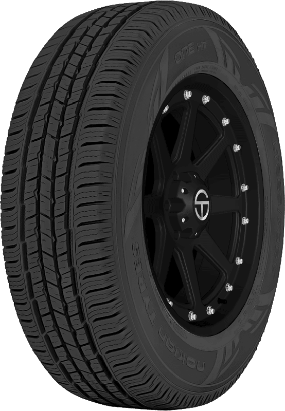 Features include: Designed for use on CUVs, SUVs, and light trucks; Backed by a 70,000 mile limited manufacturer tread life for P-metric sizes and a 55,000 mile limited manufacturer tread life for LT-metric and Cargo sizes; All-season tread; Tread compound incorporates recycled and natural materials for sustainability; Black sidewall; Aramid ply layer provides extra resistance to damage from cuts, punctures, and impacts; 55,000 mile limited manufacturer tread life warranty; Zigzag circumferential grooves boost wet traction by quickly removing water from the tread; Features Aramid fibers in the sidewall for enhanced durability – 235x65R16C 121/119R Nokian One H/T Light Truck All Season Tires, part number T431203 | Nokian One H/T All Season Tires in Blackwall, 235/65R16C 121/119R | SimpleTire