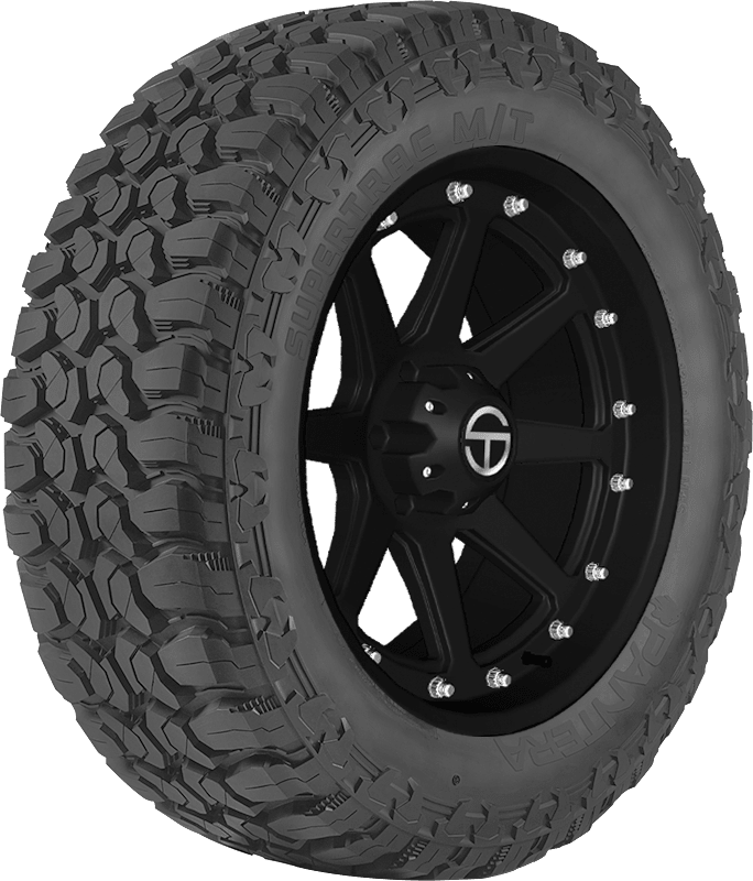 Pantera’s Supertrac M/T is a mud tire that’s designed for use on light trucks and SUVs and offers drivers strong off-road performance. – Features include: Designed for use on light trucks and SUVs that frequently drive off-road; Optimized void to rubber ratio promotes self-cleaning for consistent traction; Steel belted construction protects the sidewall from puncture; Shoulder blocks enhance handling performance; Wide grooves drain water out of the tread to increase braking and handling capabilities – LT285x65R18 125/122Q Pantera Supertrac M/T Light Truck Mud Terrain Tires, part number PT108526 | Pantera Supertrac M/T Mud Terrain Tires in Blackwall, LT285/65R18 125/122Q | SimpleTire