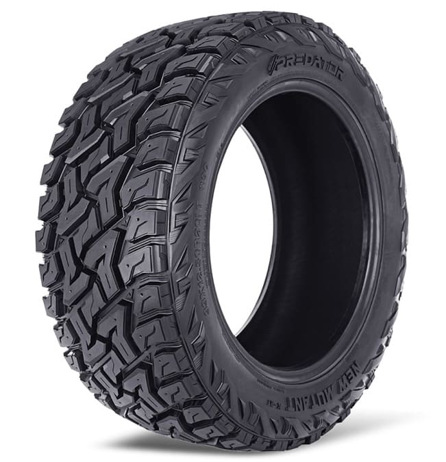 Features include: Designed for use on Jeeps, light trucks, and SUVs; Large shoulder blocks provide excellent grip in loose sand and mud; Built with large shoulder blocks that put more rubber on the ground to enhance grip; Staggered shoulder lugs improve traction in deep sand and loose mud; Widely spaced tread blocks and wide grooves force mud, dirt, rocks, stones, water, slush, snow, and other debris out of the tread for consistent traction and to protect the casing from damage; Dual sidewall design provides a different driving experience and allows drivers to decide how their tires look; Dual sidewall design gives drivers the ability to choose how their tires look; Intermediate void ratio between the tread blocks promotes self-cleaning; Engineered with staggered lugs that bite into the road to increase traction in tough off-road terrains like deep sand and loose mud – LT285x70R17 121/118Q Predator New Mutant X-RT Light Truck All Terrain Tires, part number PRXRT43 | Predator New Mutant X-RT All Terrain Tires in Blackwall, LT285/70R17 121/118Q | SimpleTire