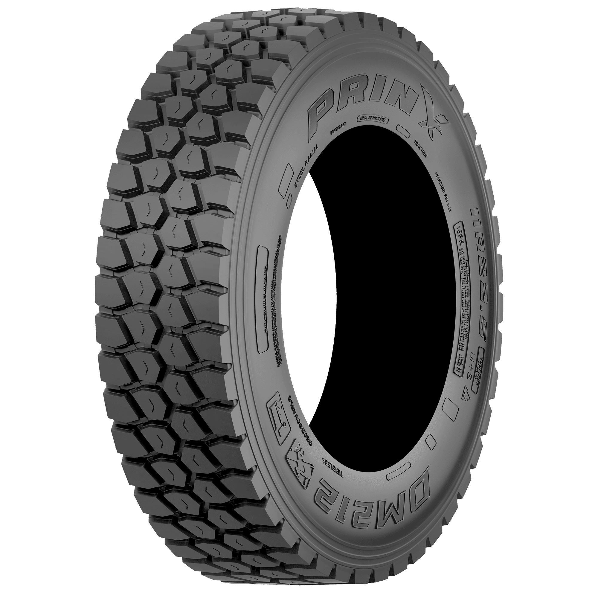 Features include: Extra rugged casing for durability in severe service; Premium tread compound for high scrub applications and resistance to damage; Deep grooves feature stone ejectors to prevent debris from damaging casing; Low void ratio enhances tread wear and keeps highway noise down; Unique crown groove design aids in heat dissipation – 11/R24.5 149/146K Prinx DM212 Commercial Tires, part number 2391250212 | Prinx DM212 Trailer Tires in Blackwall for Commercial Vehicle, 11/R24.5 149/146K | SimpleTire