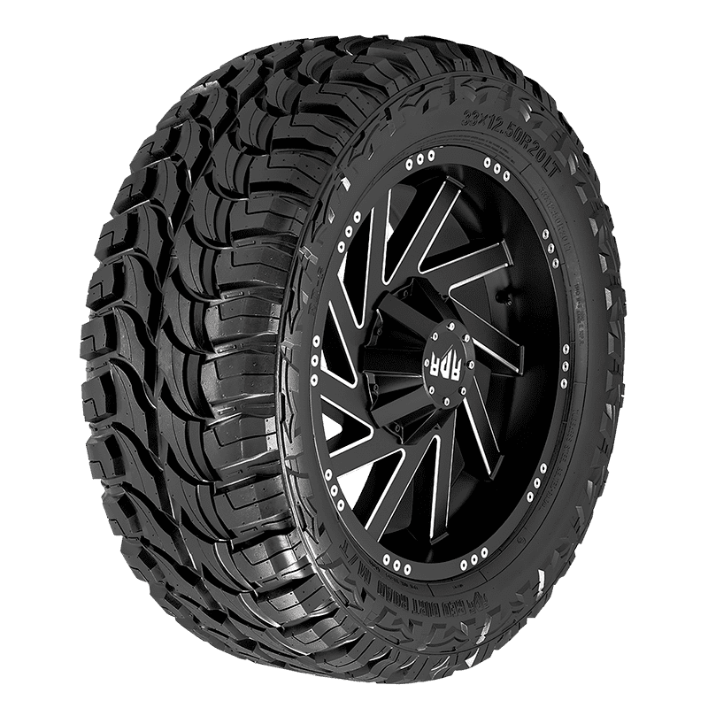 Features include: Mud-terrain tread; Black sidewall; Large staggered tread blocks enhance off-road traction and performance; A high void ratio and open shoulders force mud, dirt, rocks, sand, water, and slush out of the tread, improving self-cleaning and traction ; Its tough rubber compound increases strength and durability – LT35x12.50R22 118Q Red Dirt Road M/T RD6 Light Truck Mud Terrain Tires, part number RDR006 | Red Dirt Road M/T RD6 Mud Terrain Tires, LT35/12.50R22 118Q | SimpleTire