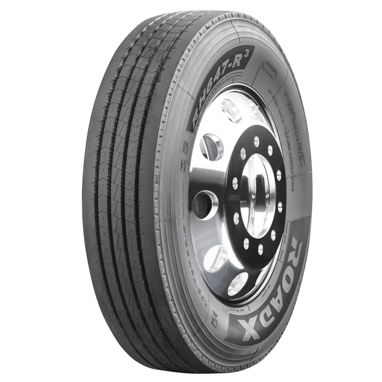 Features include: Built for use on all positions of pickup trucks and delivery vans; 5-rib tread pattern provides precise handling and excellent stability; Designed to offer improved rolling resistance in the 22.5 and 24.5 rim diameters; Circumferential grooves keep footprint clear of water and provide hydroplaning resistance; Certain sizes have sidewall protector ribs to protect against curb scrub damage – 11/R22.5 146/143L RoadX RH647 Commercial Tires, part number 5546417 | RoadX RH647 Trailer Tires in Blackwall for Commercial Vehicle, 11/R22.5 146/143L | SimpleTire