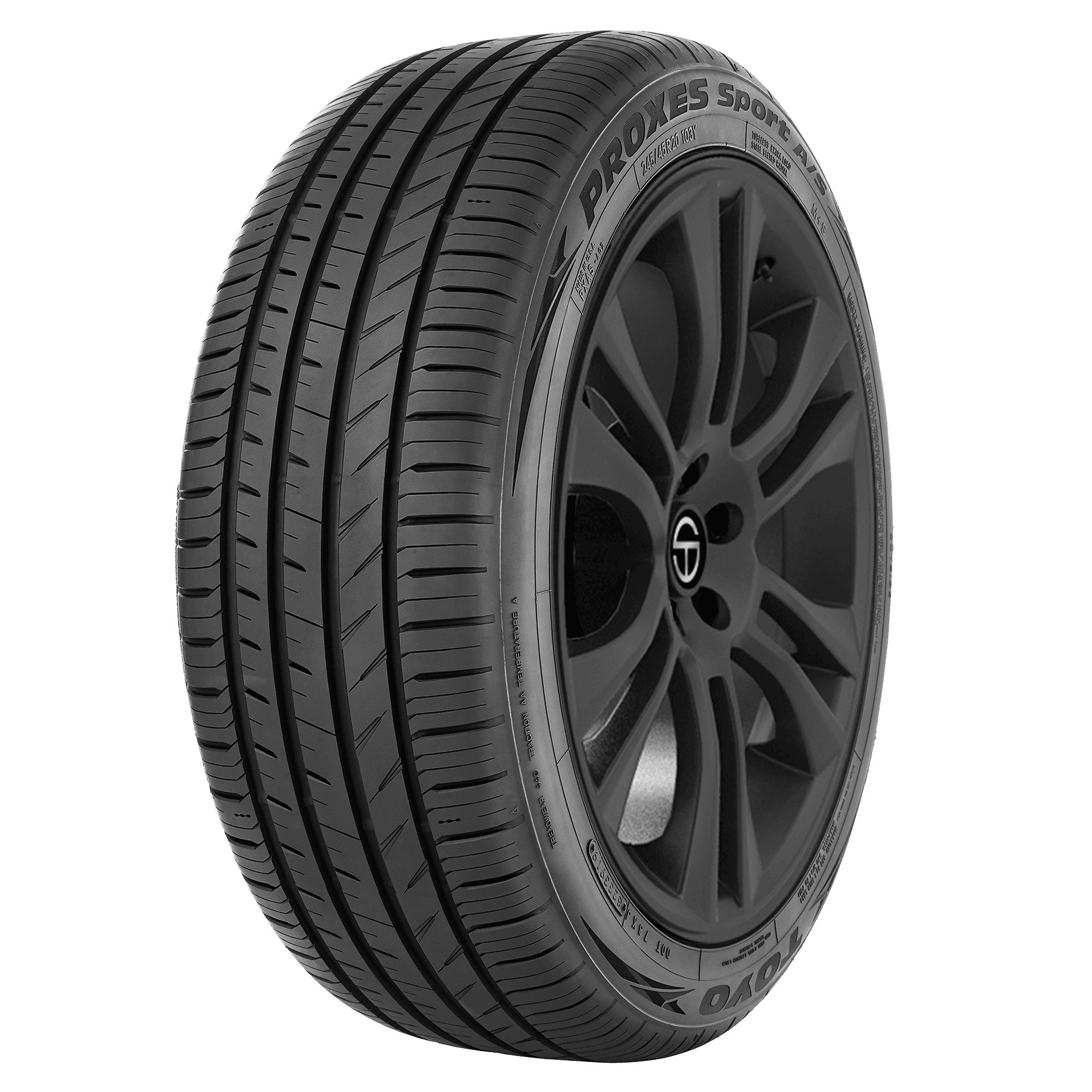 Features include: 50,000 mile limited manufacturer tread life for V- and W-rated sizes, 40,000 mile limited manufacturer tread life for Y- and (Y)-rated sizes, and 50% of stated mileage tread life for rear tires in staggered fitments; Traction is enhanced in wet conditions by a special silica compound that was developed with Nano Balance Technology; Ultra-high-performance all-season tread; Dynamic taper design improves grip for superb traction and handling.; Black sidewall; An improved rib design creates more even contact pressure to strengthen braking and handling while also boosting stability when cornering.; 50,000 mile limited manufacturer tread life warranty for V- and W-rated sizes, 40,000 mile limited manufacturer tread life warranty for Y-rated sizes, and 50% of stated mileage warranty for rear tires in staggered fitments.; Multi-wave sipes minimize irregular wear for a quiet ride and improve performance in wet and dry conditions; Specialized silica compound developed with nano balance technology provides enhanced trac – 265/35R19 98Y Toyo Proxes Sport A/S Passenger UHP All Season Tires, part number 214780 | Toyo Proxes Sport A/S UHP All Season Tires in Blackwall, 265/35R19 98Y | SimpleTire