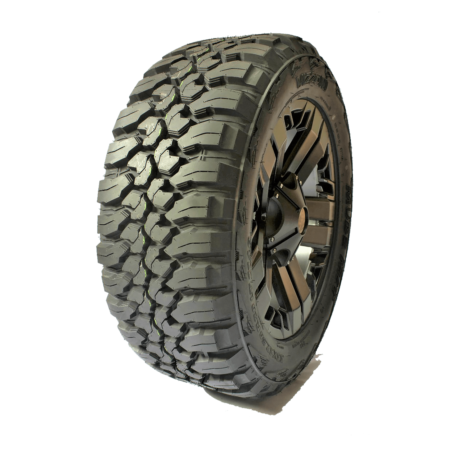 Features include: Mud-terrain tread; Black sidewall; Aggressive, high void tread pattern easily sheds mud and snow; Designed for light trucks and SUVs; Deep Grooves to ensure traction and reduce the risk of hydroplaning – LT33x12.50R18 118Q Vizzoni Mudz MT Light Truck Mud Terrain Tires, part number 8M6066 | Vizzoni Mudz MT Mud Terrain Tires, LT33/12.50R18 118Q | SimpleTire