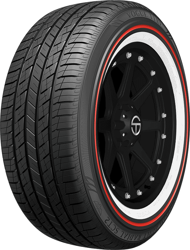 Features include: All-season tread; Backed by a 60,000 mile limited manufacturer tread life; Exclusive whitewall design or patented design with Red Stripe; Sloping Tread Elements have been 3D designed to provide a quieter ride by lowering tread noise harmonics; 60,000 mile limited manufacturer tread life warranty; Miracle Tread Compound helps to increase traction at low temperatures, while extreme silica technology provides exceptional wet grip; Specialized tread compound increases traction even at low temperatures, and silica technology provides exceptional wet grip; XL Load Range means the sidewalls of our tire are stronger, and capable of handling heavier load requirements – 305/35R24 112H Vogue Custom Built Radial SCT2 Red Stripe Passenger All Season Tires, part number 3113241 | Vogue Custom Built Radial SCT2 Red Stripe Tires, 305/35R24 112H | SimpleTire
