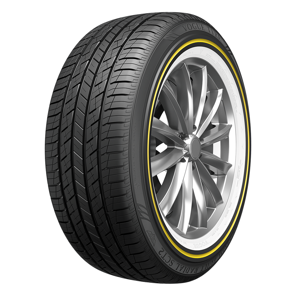 Vogue Custom Built Radial Sct2 With Our Exclusive White And Gold Sidewall Design, Not Only Will Your Car Have Great Style, But The Wide, Aggressive Tread Ensures Superb All-Season Traction, Handling, And Stability. Custom Built Radial Sct2 Provides Uncompromising Quality For A Superior Ride. Our Industry-Leading Craftsmanship Guarantees Enhanced Wear And All-Season Performance.