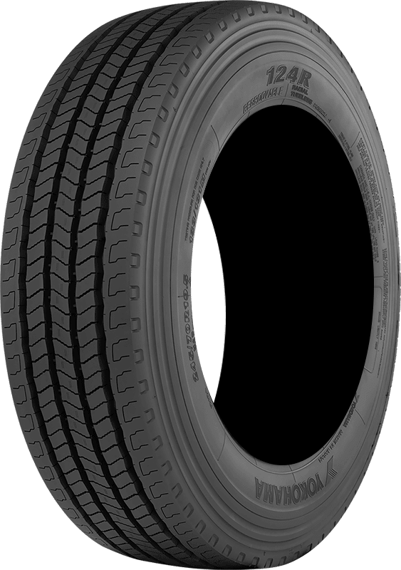 Features include: Deeply-siped ribs provide outstanding wet and snow braking creating powerful traction; Designed for use on all positions, including the steer axle, of commercial trucks and buses in regional and pickup and delivery applications; Three Peak Mountain Snowflake certified for use in moderate to severe winter weather conditions; Four wavy circumferential grooves promote even wear and provide optimized traction in the wet and snow; Deep sipes and four wavy grooves improve performance in wet and winter weather; Extra wide tread promotes better dispersal of contact pressure with the road to deliver longer tread life; Built with Yokohama’s Rock Shield Platforms that prevent rocks and debris from penetrating the casing to increase durability and retreadability; Rigid shoulder ribs reduce shoulder step-down wear and enhance driving stability; Large footprint and rigid shoulder ribs put more rubber on the road to increase stability and fend off uneven wear; Rock shield platforms reduce stone and debris penetration for im – 295/80R22.5 154/149M Yokohama 124R Commercial Tires, part number 120112411 | Yokohama 124R Trailer Tires in Blackwall for Commercial Vehicle, 295/80R22.5 154/149M | SimpleTire