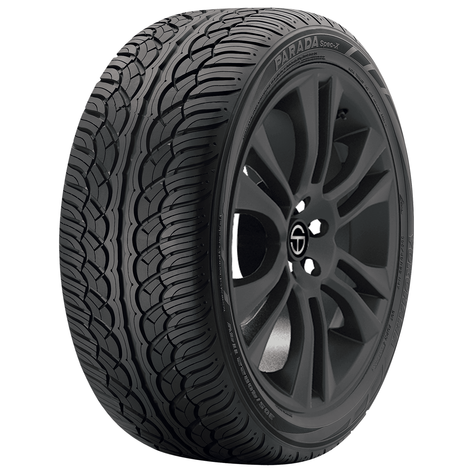 Combining aggressive looks with excellent control is the Yokohama Parada Spec-X tiees which is specially designed for heavier vehicles like SUVs, performance pickups and light trucks. The tireâ¢s ability to handle year-round traction makes it perfect for driving during various weather conditions, including light snow. The rim protector side wall protects the tires from damage with the added protection of dimples which help minimize heat buildup for longer tire life. – Features include: Circumferential grooves force water out of the tire to reduce the risk of hydroplaning on wet roads; All-season tread; Built with an aggressive, directional tread design that improves acceleration and braking performance in wet weather while also helping to reduce the risk of hydroplaning; Black sidewall; Multi-pitch tread pattern reduces road noises to create a quiet, comfortable ride for drivers and passengers; Features reinforced shoulder blocks that increase stability when cornering and reduce uneven wear for a longer tread life; Shoulder blocks are reinforced to reduce wear; Utilizes a wide, flat profile and heat relieving dimples that reduce uneven wear for a longer tread life – 325/50R22 116V Yokohama Parada Spec-X SUV/Crossover Performance Tires, part number 110100241 | Yokohama Parada Spec-X Performance SUV/Crossover Tires in Blackwall, 325/50R22 116V | SimpleTire