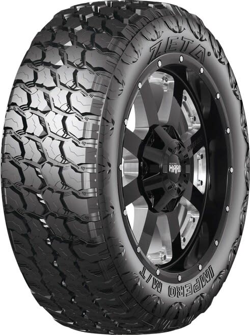 Features include: Innovative tread block design with high void ratio and built in stone ejectors for self cleaning and consistent traction; Large footprint boosts traction and control on or off road; Ideal for use on Jeeps and light trucks – LT33x12.50R20 114Q Zeta Impero M/T Light Truck Mud Terrain Tires, part number 7110601 | Zeta Impero M/T Mud Terrain Tires in Blackwall, LT33/12.50R20 114Q | SimpleTire